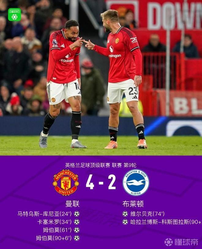 英超第9轮,曼联主场4-2击败布莱顿,这是曼联自去年2月以来首次取得单赛季英超三连胜。